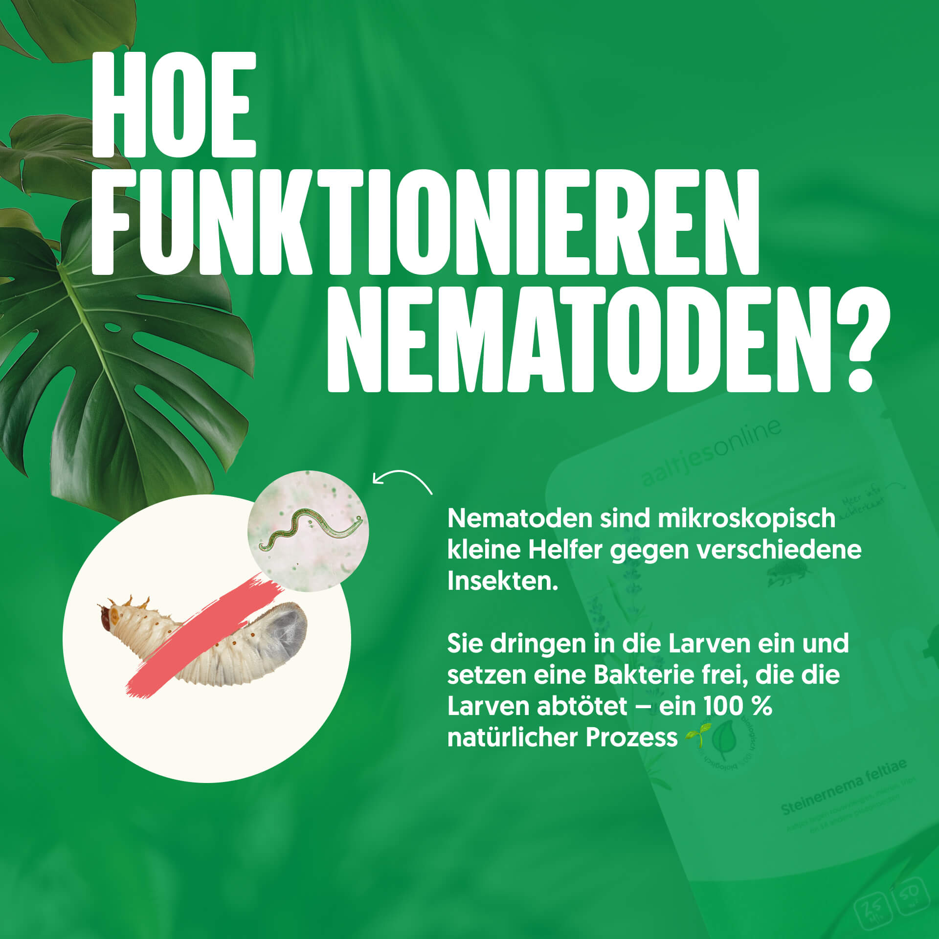 Die mikroskopisch kleinen Nematoden dringen über natürliche Körperöffnungen in ihre Schädlinge ein. Dieser Prozess wird als parasitär bezeichnet. Im Inneren setzen sie Bakterien frei, die die Schädlinge abtöten.
